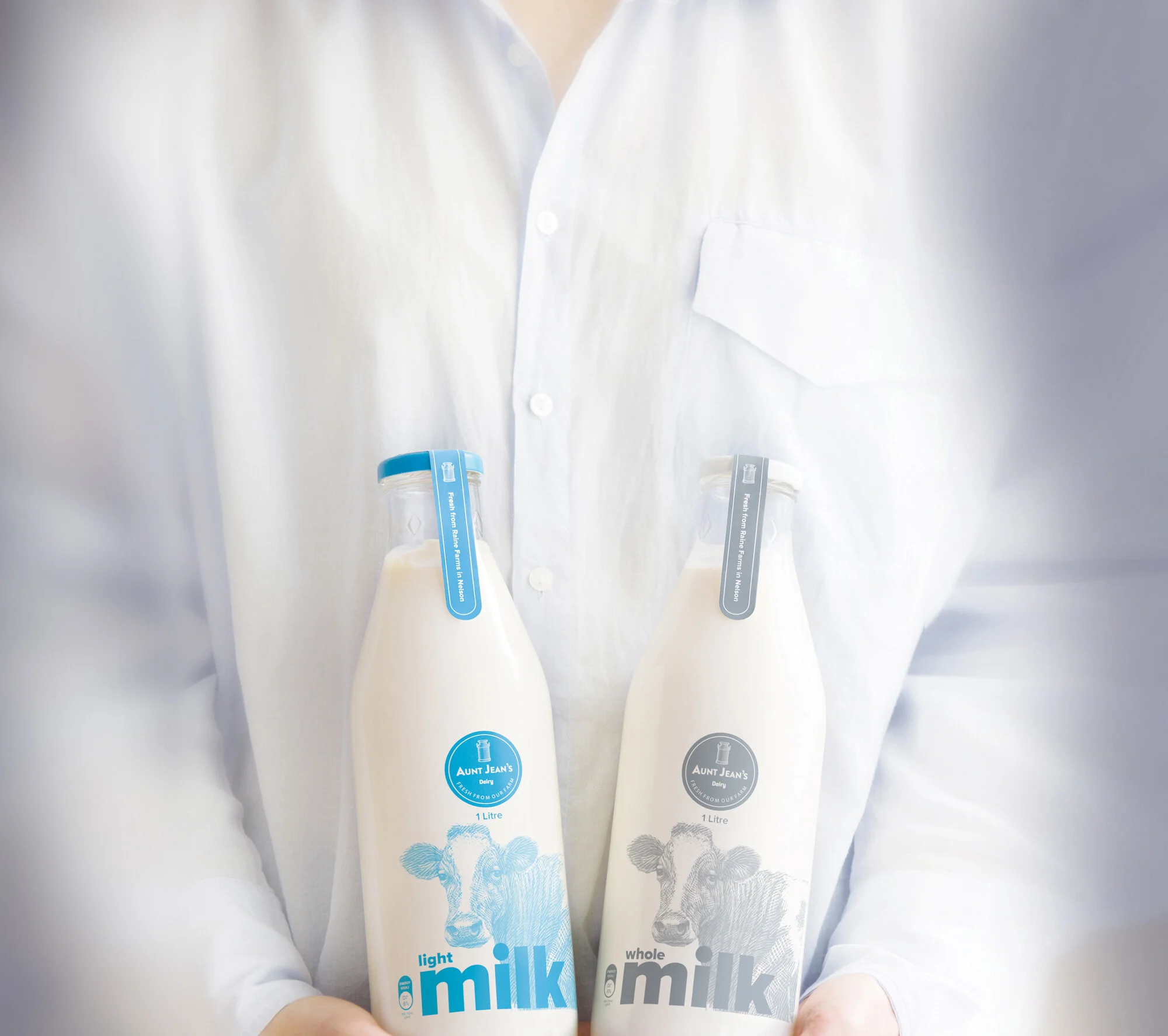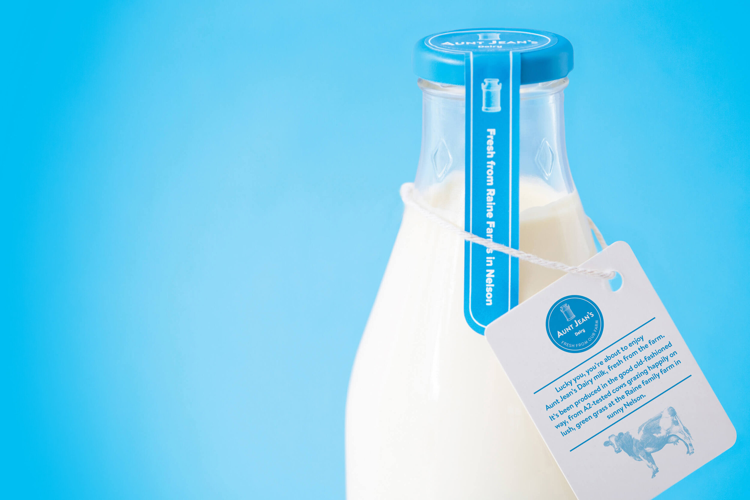 During more than 80 years of dairy farming in Nelson, the Raine family has maintained a passionate belief that customers want a direct connection with the farm producing their milk. And in today's world, that feels more important than ever. Julian and Cathy Raine have created Aunt Jean's Dairy so you can experience milk the way it should be. Farm-fresh milk delivered in clear glass bottles.